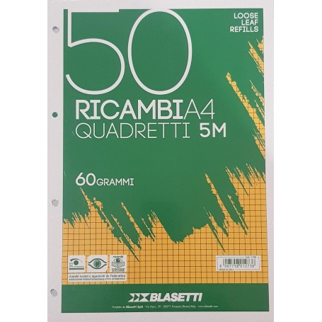 Ricambi Blasetti in carta bianca usomano da 60 g/mq con 4 fori . I ricambi sono A4 21x31 cm, in confezione da 50 fogli. Prodotti con energia solare, testati e approvati da Federottica. Rigatura 5mm.